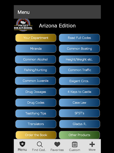 Designed for Arizona Police. This application was designed based on our famous pocket book version currently sold in AZ police stores. You can search Penal, Traffic, ABC, Health and Safety Laws by keyword or browse Codes. It has Miranda, narcotic codes, Drug symptomology domestic violence codes, translator cheat sheets for Six various languages, car theft info, and so much more. We have also included a custom section to add your own department info (ie. Municipal codes, radio codes, policies, etc.) This application can also be customized to your specific Police Department.